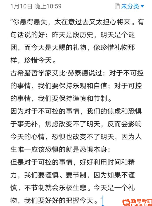 - 最后一個(gè)月不要陷入無意義的內(nèi)耗,各種擔(dān)心自己考不上,沒有學(xué)習(xí)的動(dòng)力,浪費(fèi)了很多時(shí)間和精力,甚至還反復(fù)下載求職軟件,還沒收到結(jié)果就判定自己考不上,給自己找后路。在備考復(fù)試的過程中我就心態(tài)很好,因?yàn)榭戳肆_翔老師的一個(gè)視頻,他說的一段話深深打動(dòng)了我,也轉(zhuǎn)變了我對(duì)未知的態(tài)度。分享給大家,與你們共勉!